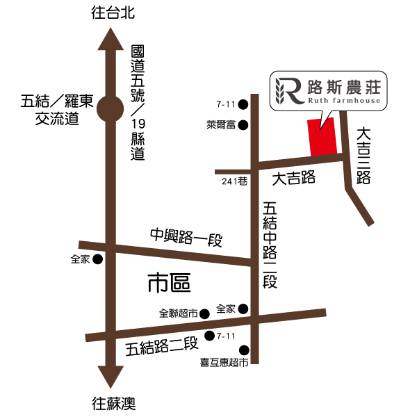 路斯農莊位於宜蘭中心點-五結,距離羅東夜市、傳藝中心、冬山河親水公園等知名景點,車程約5-10分鐘。無論是深度漫遊,或輕鬆短宿,都能自在安排,隨興前往。